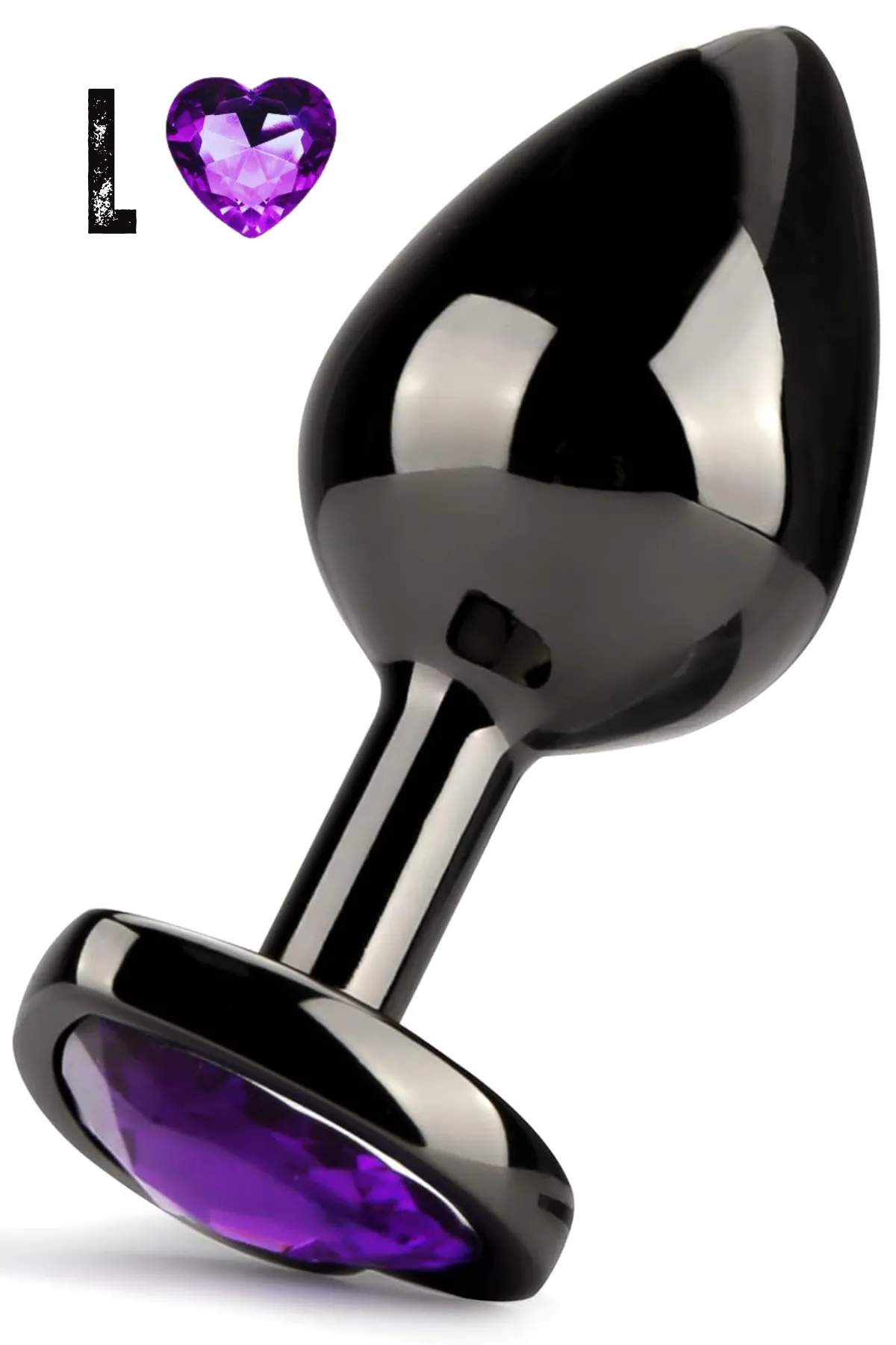 Paslanmaz Çelik Mor Kalpli Mücevher Taşlı Pürüzsüz Siyah Metal Anal Butt Plug - Büyük Boy