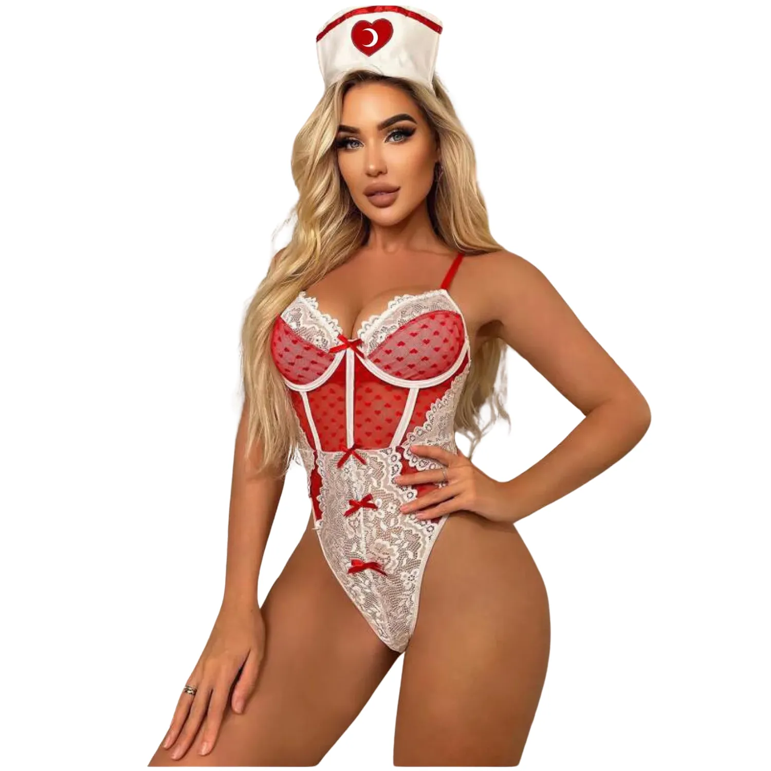 Sens Seksi Kırmızı-Beyaz Dantelli Şık ve Rahat Tasarımlı Erotik Hemşire Kostümlü Babydoll